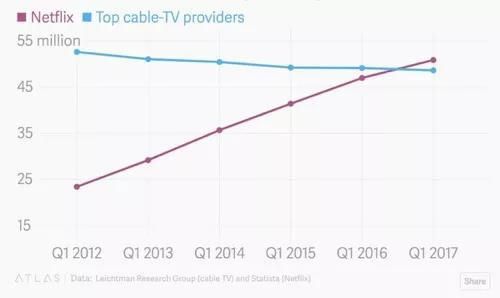 网飞凭借着目标之稳、选择之狠、手段之准,成功地上到了业内王者段位,用户数突破亿级大关。2017年,网飞的用户量超过了美国有线电视用户的总和。