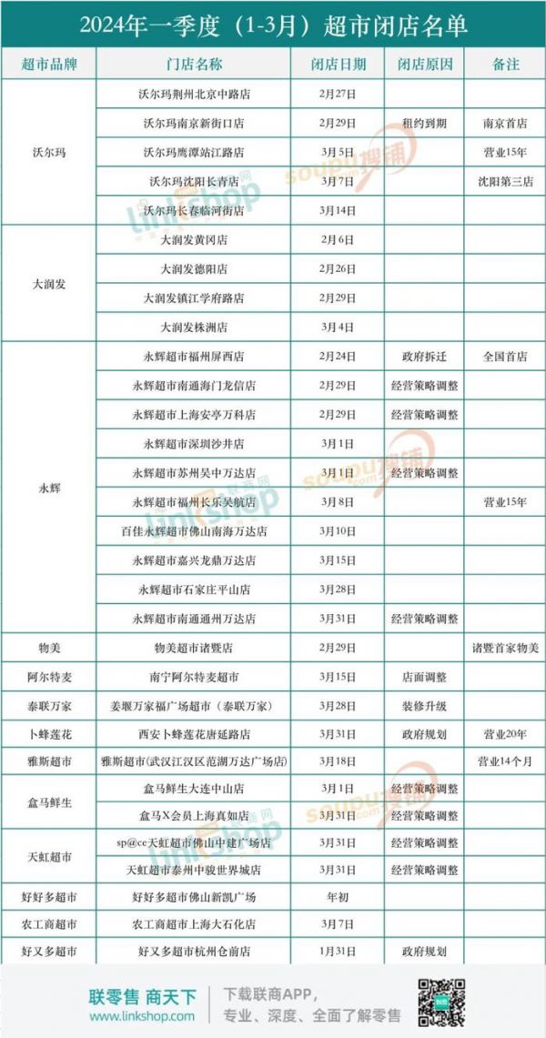 据《联商网》不完全统计,2024年第一季度全国至少有31家超市歇业,涉及沃尔玛、大润发、永辉、物美、天虹超市、盒马鲜生、卜蜂莲花等知名品牌。
