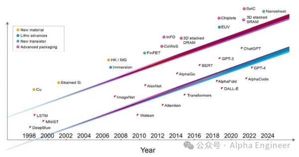 IBM的Deep Blue采用的是0.6微米和0.35微米的混合芯片制造工艺。赢得ImageNet竞赛的神经网络模型,背后是基于40纳米制程的芯片工艺。在围棋界独霸天下的AlphaGo,采用的是28nm的制程工艺。轰动全球的ChatGPT,则是基于4nm工艺。