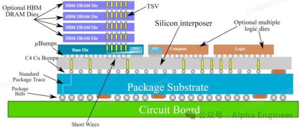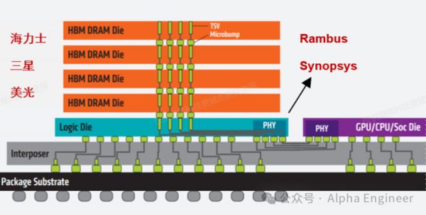 HBM在控制逻辑IC之上,垂直堆叠了若干DRAM芯片,并采用TSV(硅通孔)进行垂直互联,让信号能够穿过每个芯片的焊锡凸点,从而形成存储芯片之间的连接。