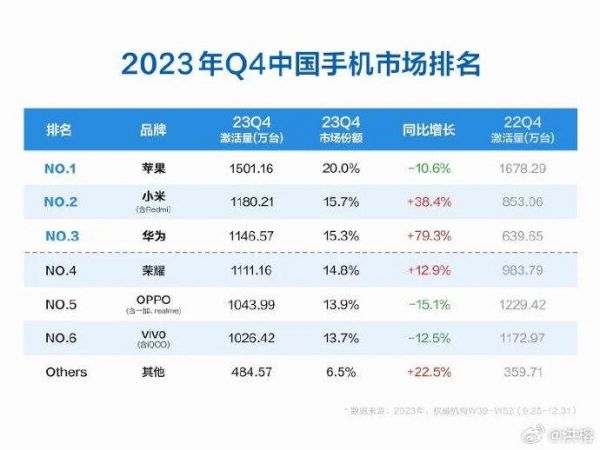 今年一季度手机销量排名,与去年四季度比前六名倒过来了