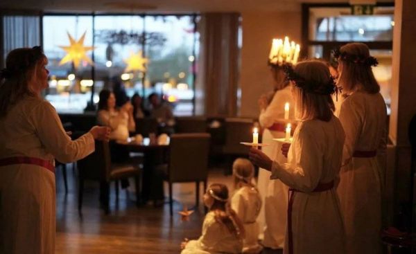 重点是,据实地观察,有了从教会请来的圣露西亚少女们捧场,这个节日绝非国内五星酒店这些无脑跟风硬蹭个什么XX美食节,也不是简单的吸引注意力热闹热闹,成为了当地一年一度的盛事,所有餐厅餐位一个月前预订一空,酒店房间也是价格狂涨,甚至翻倍。