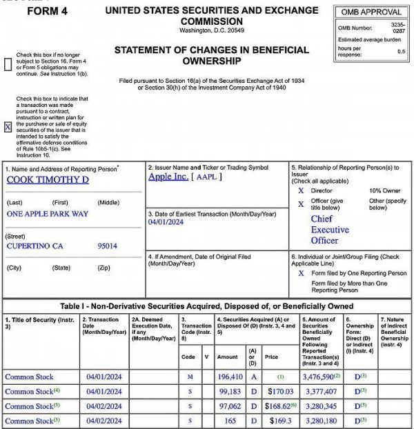 据多家媒体4月5日报道,SEC监管文件显示,苹果CEO蒂姆・库克在4月1日和2日两天之内出售了19.64万股股票,套现超3300万美元(约合人民币2.4亿元)。