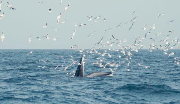 一般认为,布氏鲸存在近岸型布氏鲸(Balaenoptera edeni edeni)和远海型布氏鲸(B.e.brydei)两个亚种,涠洲岛海域的是近岸型布氏鲸。此处海域有着丰富的鱼群,此外,还有几十公顷人工保育的珊瑚礁,吸引布氏鲸前来捕食、栖息、繁衍。每年 12 月至次年 4 月是布氏鲸活动最频繁的时期,在天气暖和、风平浪静的日子最适宜寻鲸。空中盘旋聚集的海鸥群是最显著的信号——每当布氏鲸出水换气时,海鸥会立刻蜂拥而上,试图从鱼群中“捡漏”。
