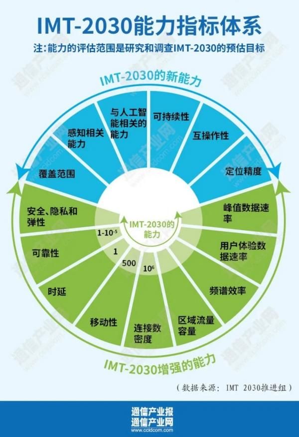 能力指标上,建议书定义了6G的峰值速率、用户体验速率、频谱效率、区域流量容量、连接数密度、移动性、时延、可靠性、覆盖能力、定位精度、感知相关能力、AI相关能力、安全隐私弹性性能、可持续性、互操作性等15个能力指标,这些能力指标包括了9个IMT-2030增强的能力和6个IMT-2030的新能力。