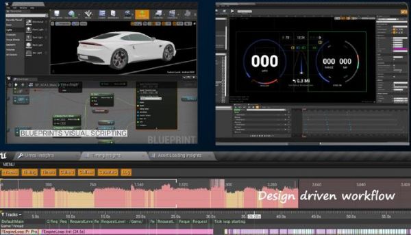 下图是UE的工作界面,具体来看,左上是基本功能的模块整合、蓝图可视化脚本。右上是面向2D的UMG UI Designer。最下方是Timing Insights,对工作流中CPU、GPU、内存的性能指标进行实时监控,帮助工程师在项目的前期、中期、后期等不同阶段迅速定位问题所在。设计师和工程师可以通过协同使用“蓝图”、UMG等部件,充分释放UE的全部潜力。