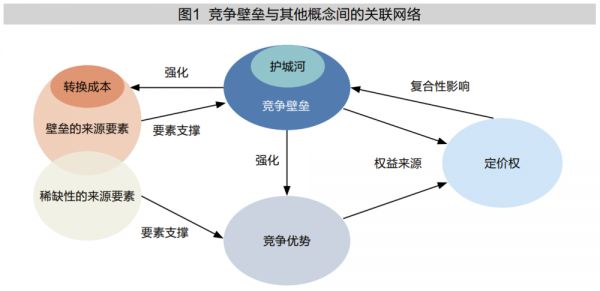 转换成本累积到一定程度会形成竞争壁垒,壁垒并不限于转换成本,壁垒的部分组成要素会提高转换成本。如图1所示,转换成本是竞争壁垒的来源要素之一,护城河则是竞争壁垒的子集。竞争壁垒和竞争优势在来源要素上存在一定的重合,且竞争壁垒的构建与发展会强化竞争优势,但竞争优势的部分组成要素并不一定能改变竞争壁垒状况。
