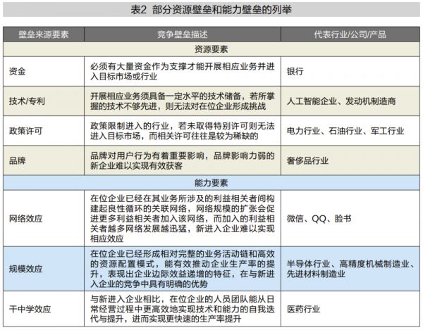 资源壁垒和能力壁垒各自所涵盖的要素丰富且互为补充(部分要素见表2),在竞争壁垒的构建过程中,企业应在准确把握经营活动对稀缺资源及稀缺能力的需求特征的基础上,结合自身的资源禀赋与发展战略,发展形成“资源壁垒+能力壁垒”的复合性竞争壁垒架构。