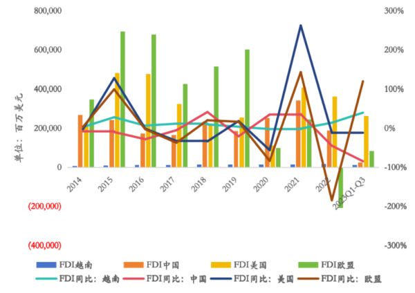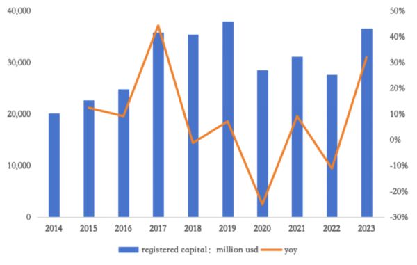 2023年FDI(foreign direct investment)同比2022年增长32.1%,达366.1亿美元;从新增项目数量上来看,同增56.6%,达3,188件。