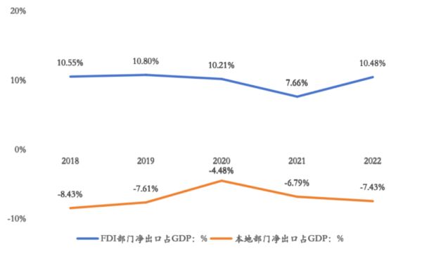上文有一组数据:2022年FDI部门出口占总进口接近四分之三(74.3%),进口占总进口的65%。忽略5%的差别,越南2022年的总进口≈总出口≈GDP。所以,只看FDI部门的话,外企的净出口约占GDP 的10%。