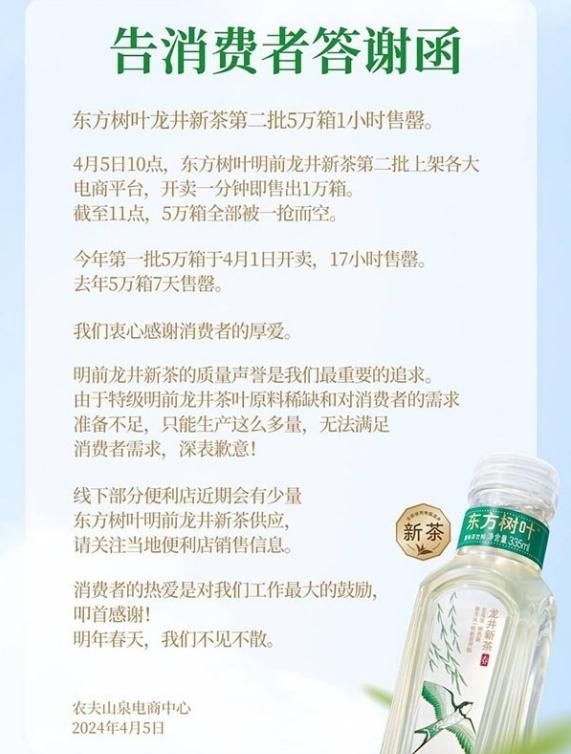 由于销售战绩亮眼,农夫山泉电商中心专门发了一封《告消费者答谢函》。农夫山泉表示,明前龙井新茶的质量声誉是我们最重要的追求,由于原料稀缺,只能生产这么多的量,不能满足大家的需求。近期,部分便利店会有少量明前龙井新茶供应,我们明年再见。
