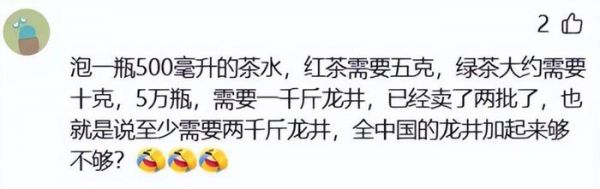 这本来是农夫山泉的庆祝时刻,不过也得到了很多网友的质疑。因为就算把全杭州的明前龙井都收过来,也泡不出5万箱的茶饮。也有网友按照每500ml配10g绿茶计算,5万瓶需要1000斤龙井,而且已经卖了两批,也就是说需要2000斤明前龙井来泡,全国有这么多的龙井吗?