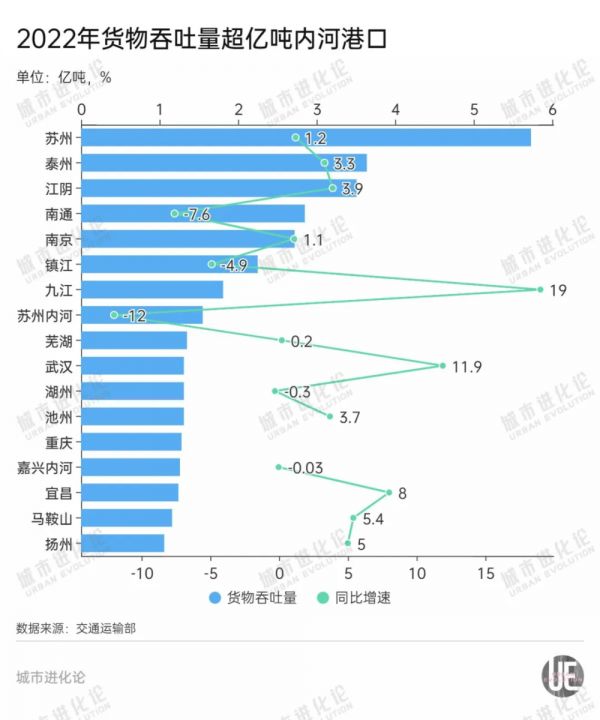 对比之下,南京港货物吞吐量尚不足苏州一半,仅排在内河港口第五位。而在南京身后,长江中上游武汉等城市的航运体量也迅速增长、迎头赶上。