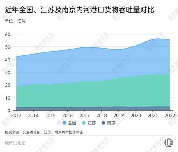 而这座水运大省眼下的目标,是进一步变成水运强省。2023年,江苏提出,充分发挥江苏海江河湖联动的特色优势,进一步推动运输结构优化调整,打造更具特色的“水运江苏”。其中还着重提及,“提升南京区域性航运物流中心能级”。