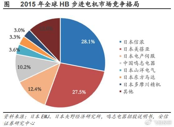 鸣志电器是步进电机龙头,此前全球一直由日本掌控着大部分市场份额。2015年全球步进电机CR3为68%,均为日本企业,公司以10.18%的市场份额排名第四。