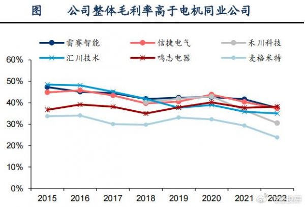 得益于空心杯、无刷电机等高价值量单品营收上涨,和海外营收占比的增加(海外市场毛利率比国内高出10%),公司2022年毛利率高达38.20%,远超雷赛智能、汇川技术、麦格米特等可比公司。