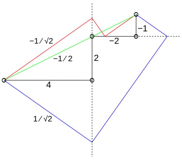 所以,问题本质上就是用折纸的方法,确定由原点出发的那段红线的斜率,保证红线折线段最后可以落在终点上。具体论证比较繁复,有兴趣的朋友可以见参考[7]里的详细资料。