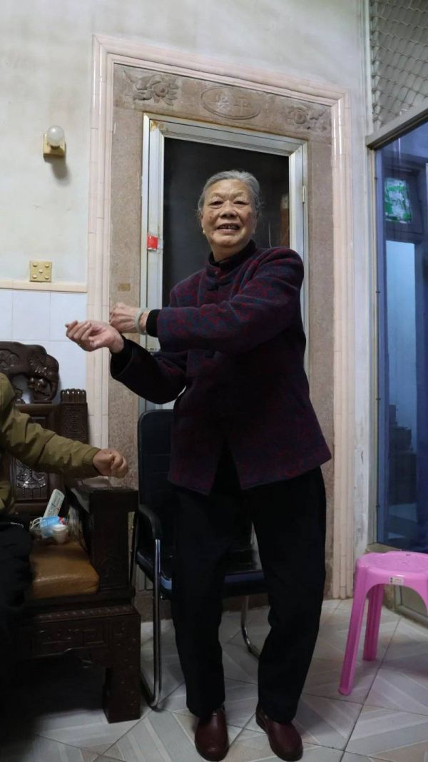 桃园女子英歌队第一代队员林梅枝正在示范“老六下”