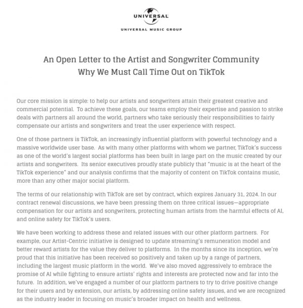 1月31日,环球音乐在官网发布了一篇名为《为什么我们必须叫停TikTok》的公开信,指出环球音乐与 TikTok 就音乐版权报酬过低、推广 AI 创作的风险、针对艺术家的不当言论这三个核心问题无法达成一致,故将于1月31日合同到期后,暂停与 TikTok 的合作。