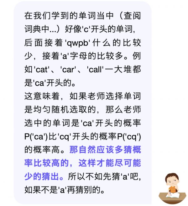 那下一步呢,下一步就要考虑什么样子的字母或单词接在'ch'后面比较常见,概率比较高。这时候学生就要考虑概率P(?|ch)的?,对于不同的字母表现如何,学生们当然要猜P(?|ch)更大的,因为这样更有机会猜对。学生又翻了一通词典,按照出现频率的大小估计概率,再用概率依次猜出了第三个,第四个字母,是chat。