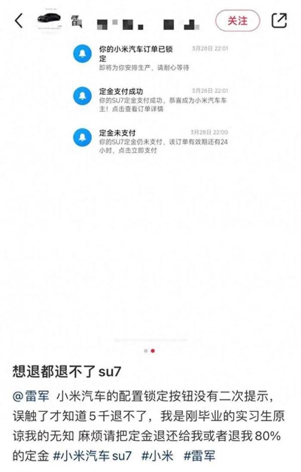 小米回应称,订金7日内支持无理由退款。但超过7日后,车辆配置会自动锁定,消费者也可以提前主动锁定配置的。一旦订单锁定,车辆将进入生产阶段,配置无法再修改,订金不退。此外,创始版现车配置已经锁定,消费者在支付2万元定金后,即锁单。