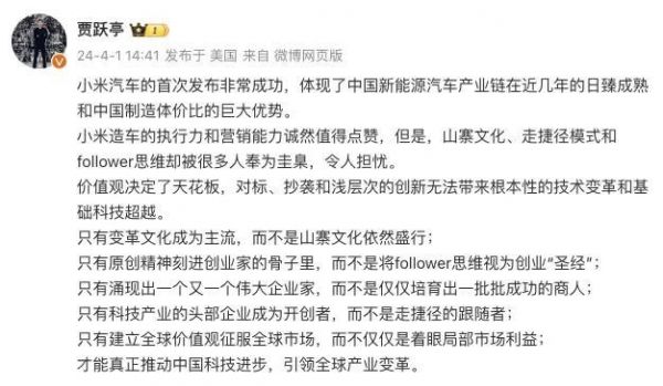 4月1日,FF创始人贾跃亭在微博发文称,小米汽车的首次发布非常成功,体现了中国新能源汽车产业链在近几年的日臻成熟和中国制造体价比的巨大优势。小米造车的执行力和营销能力诚然值得点赞,但是,山寨文化、走捷径模式和follower思维却被很多人奉为圭臬,令人担忧。贾跃亭表示,价值观决定了天花板,对标、抄袭和浅层次的创新无法带来根本性的技术变革和基础科技超越。