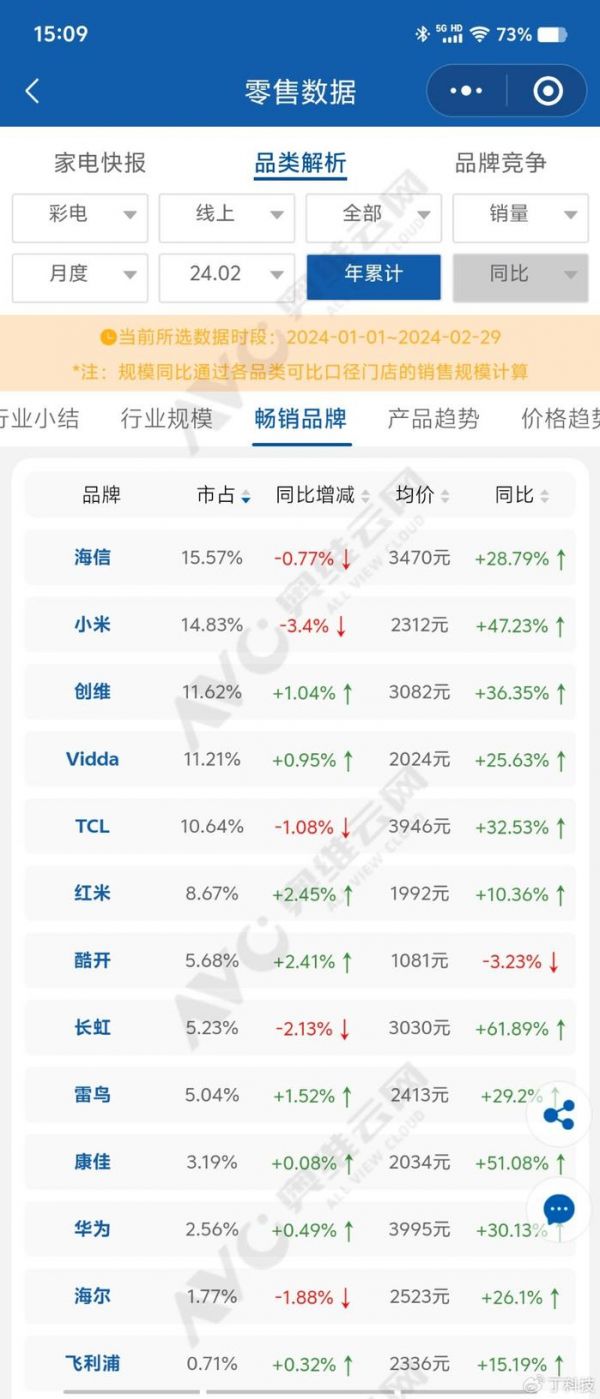 奥维云网数据显示,1-2月,线上彩电市场销量TOP5品牌分别为海信(15.57%)、小米(14.83%)、创维(11.62%)、Vidda(11.21%)、TCL(10.64%)。其中,Vidda是唯一的“子品牌”,与“母品牌”海信一起联手杀进前五。