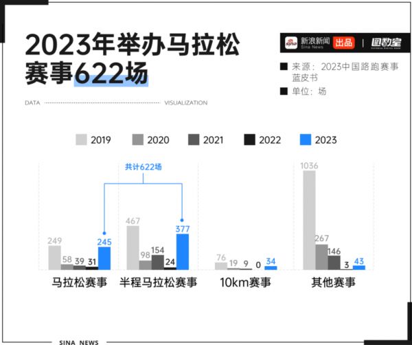 中国田径协会发布的《2023中国路跑赛事蓝皮书》显示,2023年全年共举办699场认证赛事,马拉松赛事数量(包含半马)就占了九成:其中,马拉松赛事245场,占35.05%;半程马拉松赛事377场,占比53.93%。