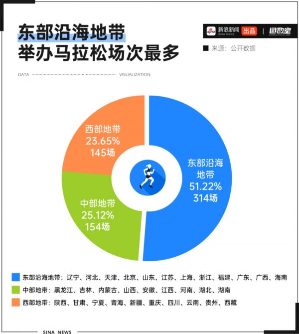 回顾去年一年,三大经济带办赛场次分别为:东部沿海地带举办了314场马拉松赛事,占总场次的52.22%,中部地带154场、西部地带145场。由此可见,各经济带举办的赛事场次,与当地经济发展水平密切相关。