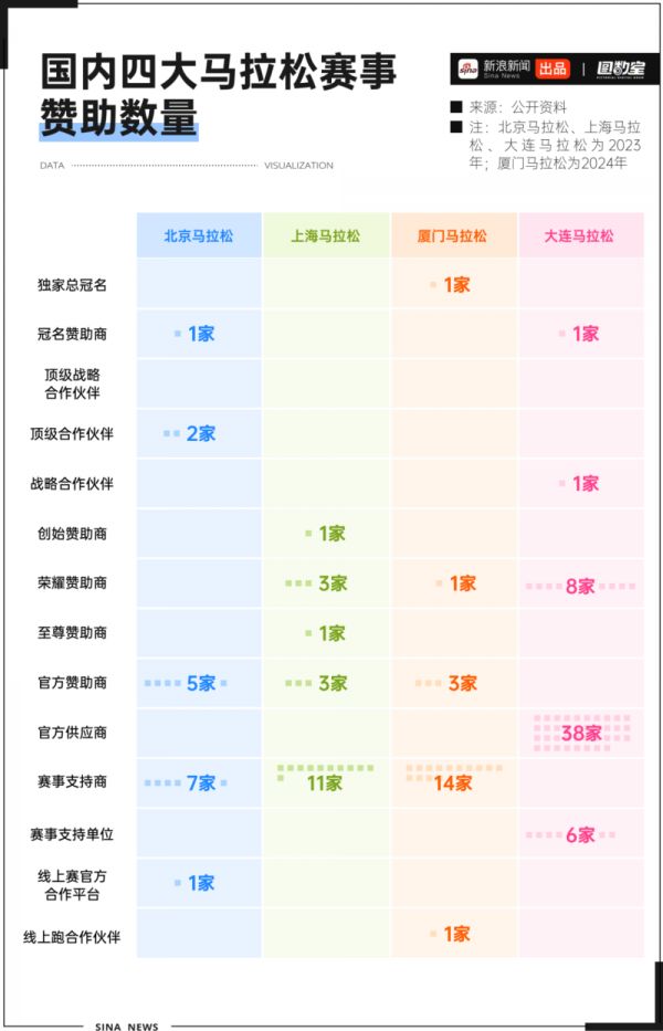 2023年,北京马拉松、上海马拉松、大连马拉松分别拥有赞助商16家、19家和54家。今年刚刚过去的厦门马拉松也拥有21家赞助商。