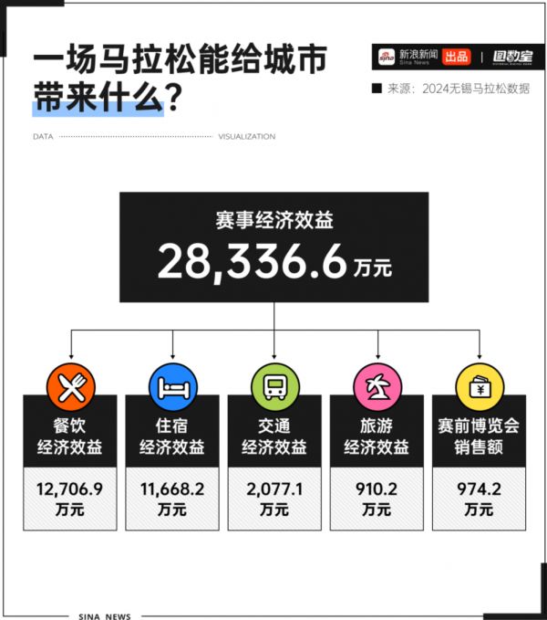 据官方统计,今年3月举办的2024无锡马拉松,估算产生经济效应约2.8亿元,较去年提升45.5%。其中,餐饮、住宿两项占了大头,分别产生经济效益12,706.9万元和11,668.2万元。