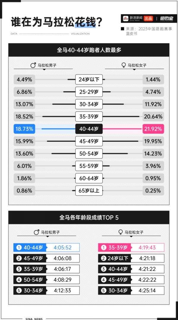 据中国马拉松协会的最新统计,参赛人群中,35~49岁的中年人群是主力军,不论男女,这个年龄段参赛人数都占比一半以上,参赛成绩也完全压制年轻人。他们作为社会的中流砥柱,有强烈的健身意愿,并且可以抽出闲暇时间练习跑步,最重要的是,他们有旺盛的消费能力。