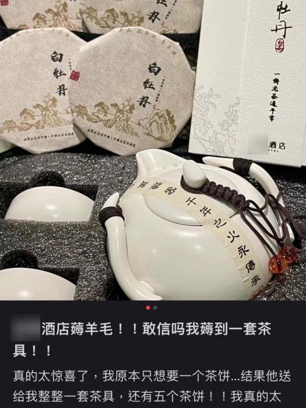 还有爱好喝茶的年轻人,想学着网络攻略帖子那样,退房前再要一个茶饼。开口前还是战战兢兢,生怕被认为“吃相难看”。意外的是,前台一听到需求,直接送了一整套茶具,还另外附赠5个茶饼。