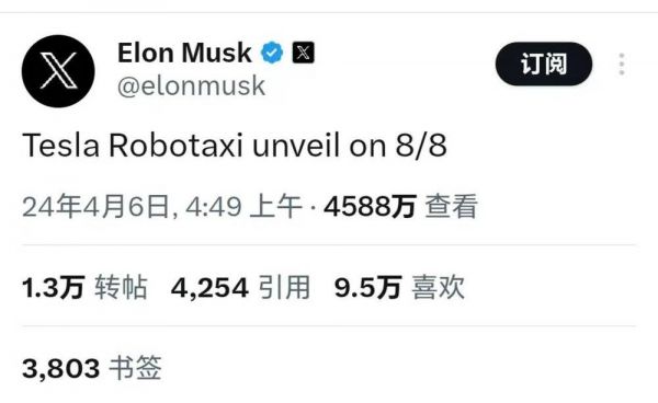 就在辟谣“Model 2”放弃研发后不久,马斯克宣布,将在8月8日发布无人驾驶出租车,即Robotaxi产品。廉价车只是辟谣没有取消,无人驾驶则直接发布了明确日程,某种程度上也反映着马斯克心中对二者的重要性排名。