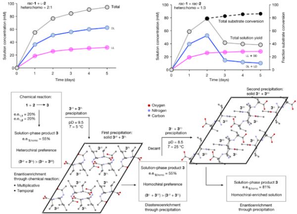 Blackmond团队通过监测不同实验条件(单一手性分子、不同单一手性分子和外消旋反应物组合、不同催化剂)下二肽的氨基酸对形成速率,发现催化肽连接反应倾向于异手性二肽产物(即L单体与D单体连接)的生成,在复杂反应混合物中会发生对称性破缺、手性放大和手性转移。