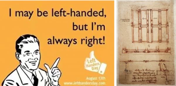 图6. “左撇子”国际日标语与达·芬奇在《大西洋古抄本》中的镜像书写手稿。