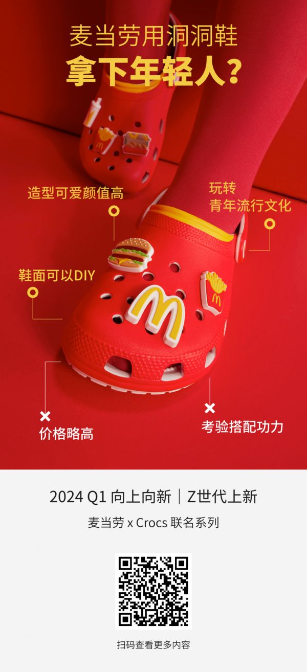 不过,在眼花缭乱的品牌合作中,麦当劳 X Crocs联名系列依然是当下最吸睛的联名合作之一,也被评为虎嗅2024 Q1向上向新产品榜·Z世代上新。
