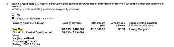 该份文件同时显示,贾跃亭在提交破产申请前的一年之内,曾于今年2月28日和7月23日分别向甘薇转账40万美元和11万美元,总计51万美元,在用途一栏标注的是“家庭费用”。