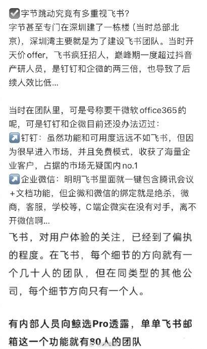 网易副总认为抖音集团的飞书团队只需1200人,而内部人员透露,单飞书邮箱一个功能原来就有80人负责。