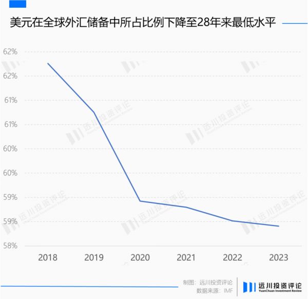 美元体系的心脏同样不平静。美元结算体系的武器化——制裁伊朗、俄罗斯等国家,让过度依赖这种法币不再是一个最好的选择。仅公开报道中,就有巴西、东盟、印度、马来西亚、沙特等国家积极开展多元化贸易结算工具。与此同时,2018年以来美元在全球外汇储备中所占的比例也逐年下降。