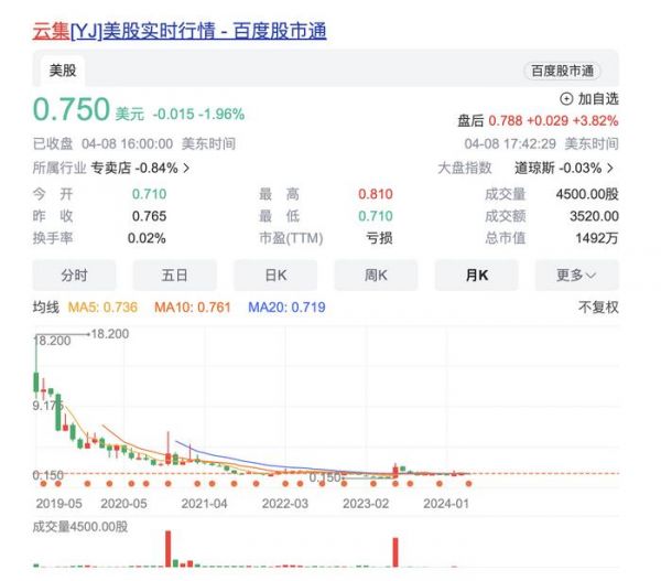 此后,云集股价开启大跳水模式。截至发稿,其股价仅为0.75美元/股,市值仅剩1492万美元,缩水超99%。