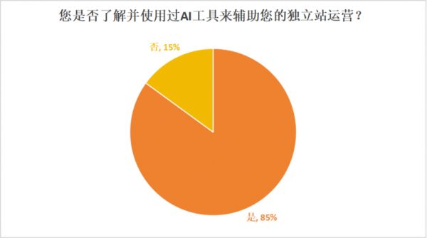 • 大多数独立站运营者(85%)表示他们了解并使用过AI工具来辅助运营。