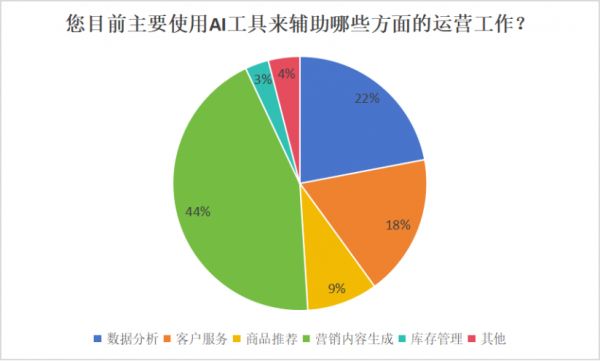 • 营销内容生成是AI工具被最广泛应用的领域,占比高达44%。