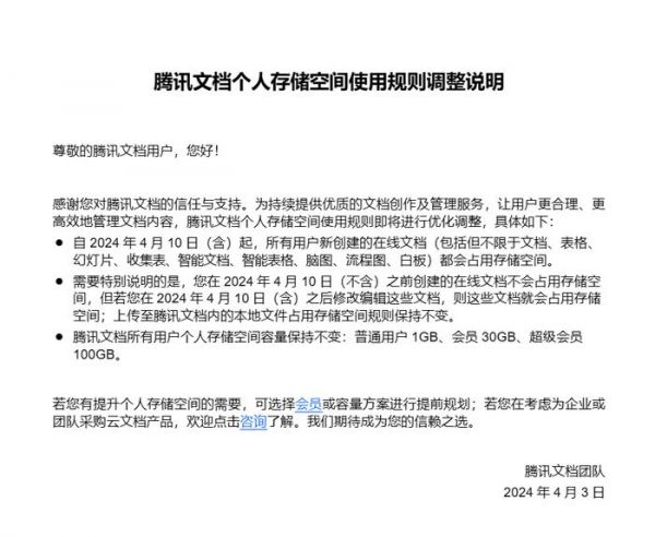 简单来说,就是从4月10日开始,所有在「腾讯文档」里创建的文档、表格、幻灯片、收集表、智能文档、流程图…
