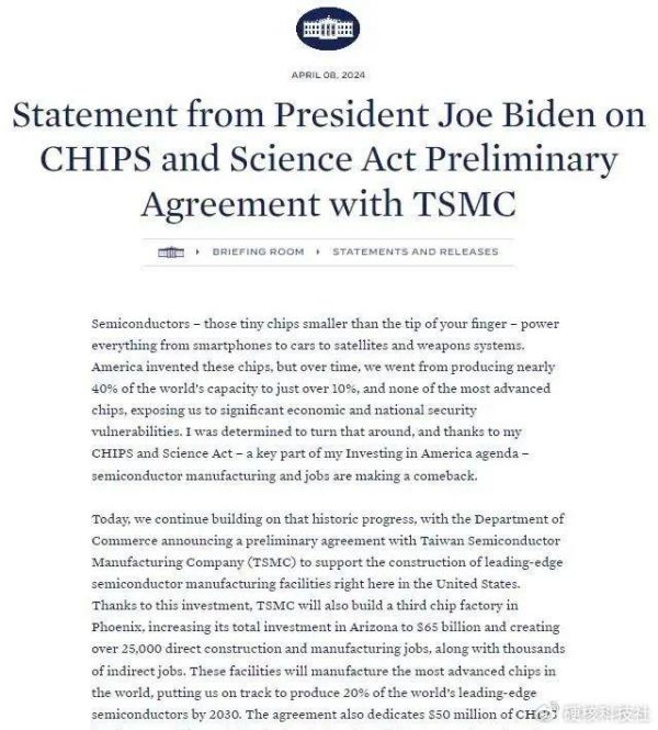 白宫的声明还提到,台积电对美国的新投资及其在亚利桑那州的扩产计划得到了美国领先科技公司的大力支持。苹果、英伟达、AMD等大客户纷纷表示,他们将利用台积电在美生产的芯片。这一系列动作不仅显示了台积电全球化战略的深远布局,也反映出美国政府在半导体产业补贴政策上的积极成效。