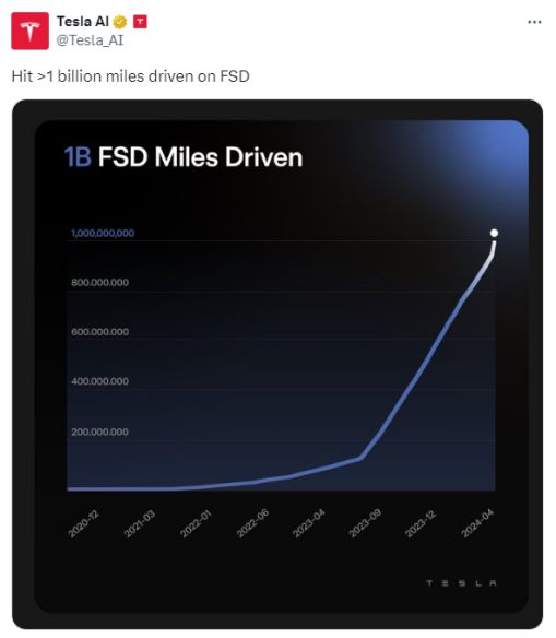巧的是,近期特斯拉官方庆祝了FSD过去三年半累积突破10亿英里(16亿公里)的里程碑。可以看出,自今年3月底全美开启免费试用一个月以来,里程数直线飙升。