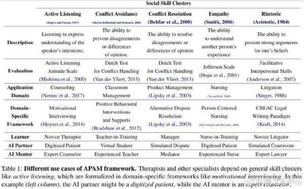 APAM 可以在许多领域提高学习者的技能,表 1 列举了一些应用场景,例如如何倾听、心理健康咨询等。不过 APAM 框架不仅限于这些典型的例子,论文第 6 节有更多的介绍。