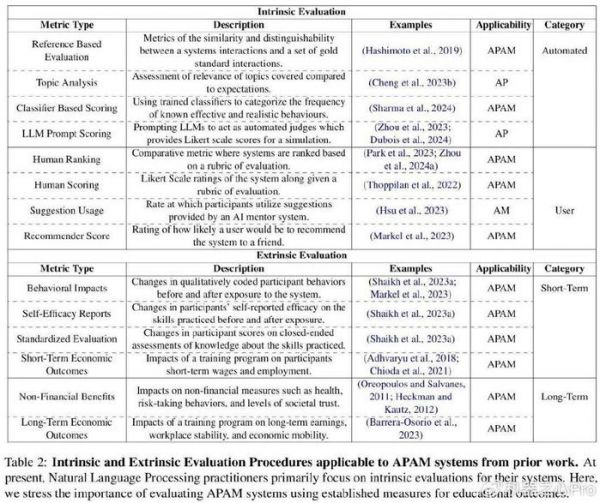 表 2 详细列出了以往工作中适用于 APAM 系统的内在和外在评估程序。目前,自然语言处理从业者主要关注对系统的内在评估。本文中,研究者强调使用既定的教育成果衡量标准来评估 APAM 系统的重要性。
