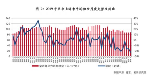 据易居研究院数据,截至2月,上海市全市挂牌房源的每平米月租金为87.8元/平/月,同比下跌22.6%,同比跌幅创2019年至今历史最大幅度。相比于2023年上海全年平均租金95.2元/平/月,当前的房租下跌了7.4元,降幅为7.8%。