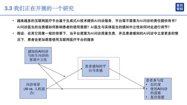 我们的理论假设是,在其他条件相同的情况下,当AI愿意为问诊质量承担责任,并且患者认为AI问诊更加客观中立时,患者更愿意使用互联网平台的AI问诊功能。这项研究仍在进行中,我们期待未来能够分享更多的成果。